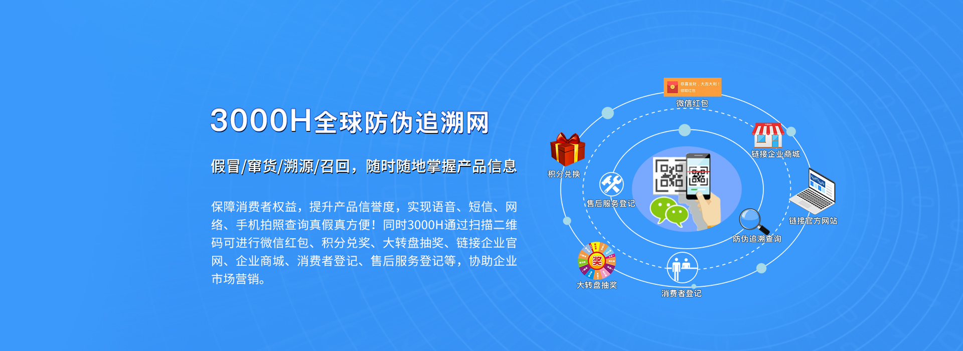 3000H 全球防偽追溯查詢系統(tǒng),利用現(xiàn)代化信息技術(shù)、網(wǎng)絡(luò)技術(shù)、編碼技術(shù)和高科技印刷技術(shù)、專業(yè)為企業(yè)提供產(chǎn)品數(shù)碼防偽,防竄貨管理,3000H平臺(tái)給每個(gè)入網(wǎng)企業(yè)分配不同的用戶名密碼,為企業(yè)每一件產(chǎn)品賦予唯一的防偽碼,實(shí)現(xiàn)手機(jī)拍照掃描二維碼,進(jìn)行防偽查詢、竄貨查詢、微信紅包、積分兌獎(jiǎng)、大轉(zhuǎn)盤抽獎(jiǎng)、鏈接企業(yè)官網(wǎng)、企業(yè)商城、消費(fèi)者登記、售后登記等,協(xié)助企業(yè)進(jìn)行市場營銷,提升企業(yè)品牌形象。